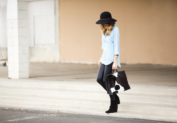 SHOP THIS OUTFIT: pants: Blank denim (similar), shirt: Bella Dahl, shoes: c/o Joie, hat: Rag + Bone, bag: Clare Vivier, bracelets: Young Frankk, Tory Burch, lips: Nars "Heat Wave"