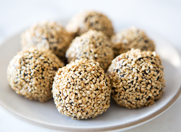 - Spread sesame seeds on a plate and roll balls in sesame seeds to cover.