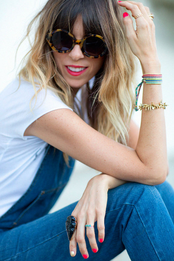 SHOP THIS OUTFIT: overalls: asos, teeshirt: zoe karssen, shoes: 80%20 via free people, sunnies: karen walker, ring: charles albert, bracelets: jcrew, stella and dot, nails: orly passion fruit and butter of london the full monty
