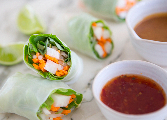 i love ordering spring rolls at restaurants, and when there's a good peanut sauce i'm completely devoted! unfortunately i haven't found a great place to get them here in the desert yet. so, i decided to tackle them myself. i'm kind of shocked at how easy they are! as in: i'll probably be eating these every day for the rest of my life. or until i hate them, whichever comes first. also, i decided to sub out the usual tofu with jicama for a healthier, crunchier roll. and i am SO glad i did. obsessed. i hope you love them as much as i do! xx- sarah {more after the jump}