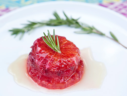 -remove rosemary from honey mixture and drizzle onto orange stacks.