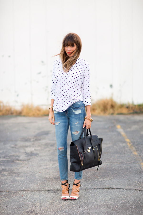 SHOP THIS OUTFIT: blouse: equipment (here and here), jeans: current elliott, shoes: vera wang, bag: 3.1 phillip lim, watch: marc jacobs, bracelet: j crew (similar)