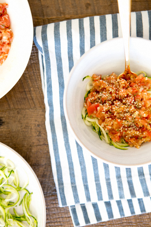 *i like to mix and then store in the fridge for a few hours to let the zucchini absorb all the yummy sauce flavors.  there's something really delicious that happens when the zucchini noodles soften and are soaked with the sauce!