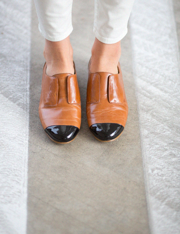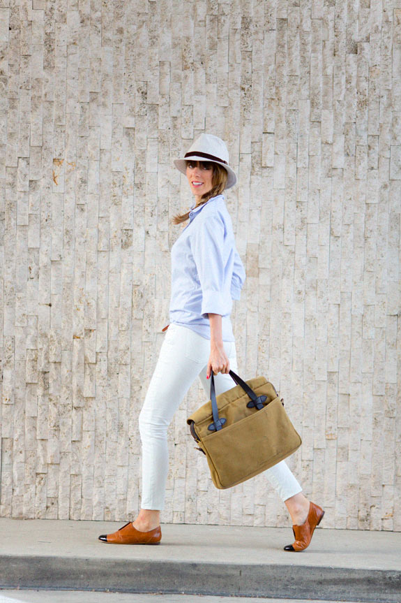 last spring I went through a menswear style phase (seen here and here). and this spring, just like tulips, it's back! so of course, as any reasonable lady would, i raided lou's closet. his striped dress shirt is perfect with my skinnies and shoemint flats (don't you love that cap toe detail?!). and that's his bag too. i'm obsessed.