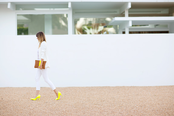 Love this look! The classic white skinny jeans make for the perfect backdrop for those neon heels!
