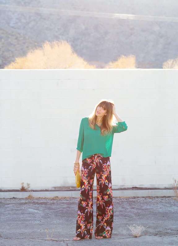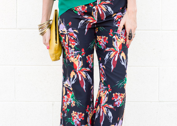 SHOP THIS OUTFIT: pants: 10 crosby derek lam and a more affordable pair of wide-legged florals here, shirt: parker (similar), shoes: stylemint, ring: charles albert, clutch: lauren merkin (old)
