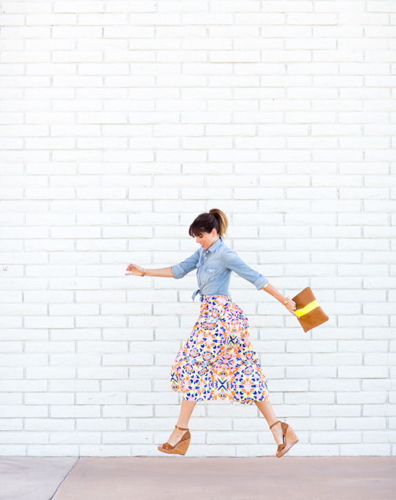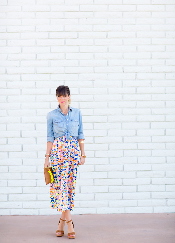 remember when i said that a chambray shirt is an absolute necessity in a closet? this outfit is a perfect example of why. it's the ideal item to layer over a neon mara hoffman dress that is probably a bit pricey if you're only going to get one look out of it. but, add a magic chambray shirt and VOILA! an entirely different outfit. the chambray tones down the neon, gives it a casual vibe, looks great with lipstick. and now, i pat myself on the back. i finally found the right rationalization for adding this dress to my closet. see how that's done? xx- sarah