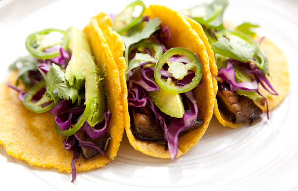 - assemble tacos by laying tortillas with slices of the grilled portobellos, slices of avocado, cilantro, cabbage and jalapeno.  squeeze with lime juice.   serve hot and enjoy!