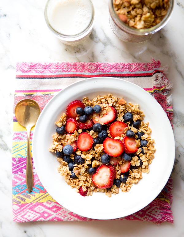 one of the questions i get most the asked when people are inquiring about what i eat is "WHAT DO YOU HAVE FOR BREAKFAST?! i think that because so many of the breakfast foods we eat in this country are dairy/meat/egg centric that sometimes the idea of a breakfast without those things is mind boggling. but let me tell you, i am a breakfast lover and will not suffer just because i don't eat the foods that we traditionally call breakfast. no ma'am. so, let me introduce you to my friend maple granola. sweet, crunchy, filling. add almond milk and piles of fresh berries and what you have, my friends, is a little bowl of heaven. eggs who? xx- sarah {more after the jump}