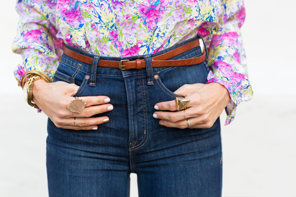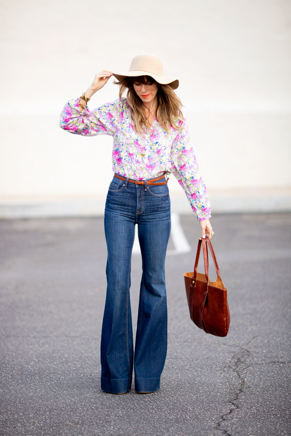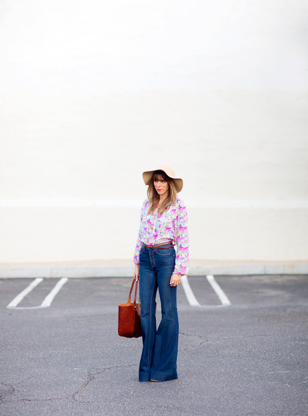 i don't care the reason or the season, high waisted bells are my jam. and i love them paired with a floral blouse and floppy hat. a touch of the 70's vibe i love with a more modern feel. groovy, no? xx- sarah {more after the jump}