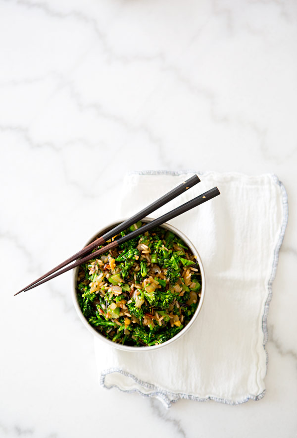 - Add rice, garlic, ginger, broccolini, tamara and ume vinegar.  Combine will and cook until broccolini is tender but still firm and bright green.