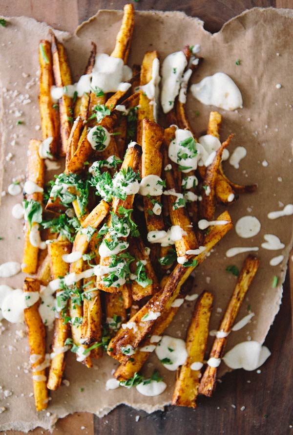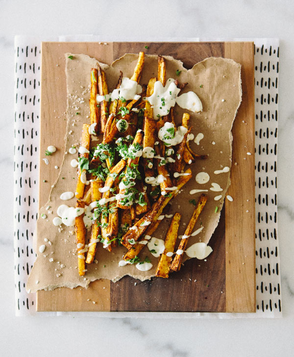 Since I'm abstaining from fried foods this month I thought I should probably come up with a recipe that would make me say "French fries, who?!" Because living without the decadence of fries is just not ok with me. So, these paprika parsnip fries were born. Baked, not fried, and topped with a preserved lemon cashew cream sauce they're vegan, healthy and COMPLETELY WONDERFULLY DECADENT!!! Oh, and silly easy. The trifecta of awesome, in my book. French Fries who? That's right. Have at it! xx- Sarah {more after the jump}