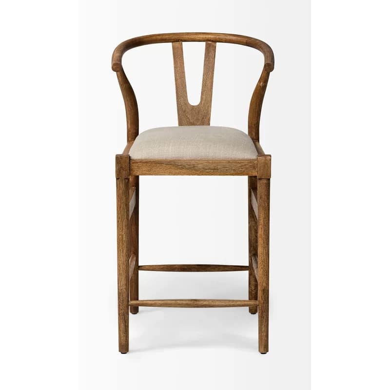 Featuring a frame crafted from natural Indian mango wood polished in a light-brown tone, this is a trendy and functional counter-height chair that will surely add a touch of novelty to your bar area. It sports a curved back with a wishbone design and a padded, natural linen seat that provides a sublime seating experience. The long legs make it feel incredibly airy and look great when paired with most bar and kitchen counters.