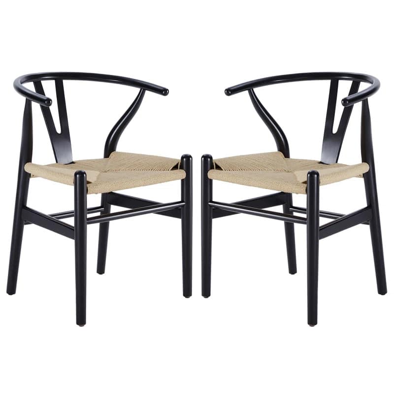 Satisfying both style and functionality, this wishbone chair is crafted from American Ash wood and comes in as an essential accent to your dining area. The set of two chairs has tapered legs with a curved back, lending a trendy modern look that will stand out in any room in your home. The seat comes in the woven cord, bringing an inviting feel and adding a nice contrast with the black body of the chair.