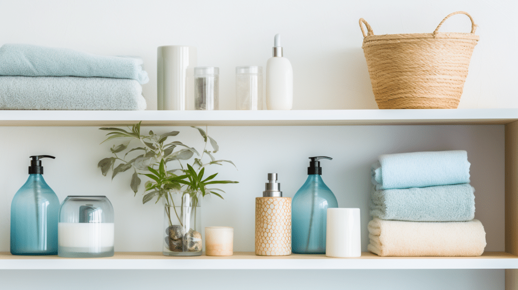 Include natural elements, such as potted plants or wooden accents, to create a warm and inviting space on your bathroom shelves.