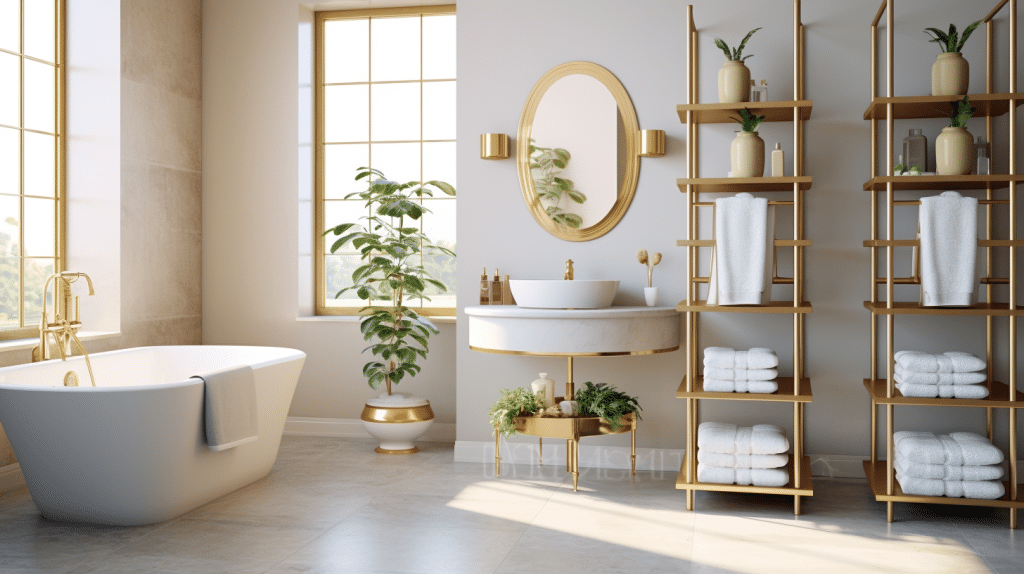 Choose small plants in golden pots or artwork with gold frames to infuse sophistication into your bathroom space.