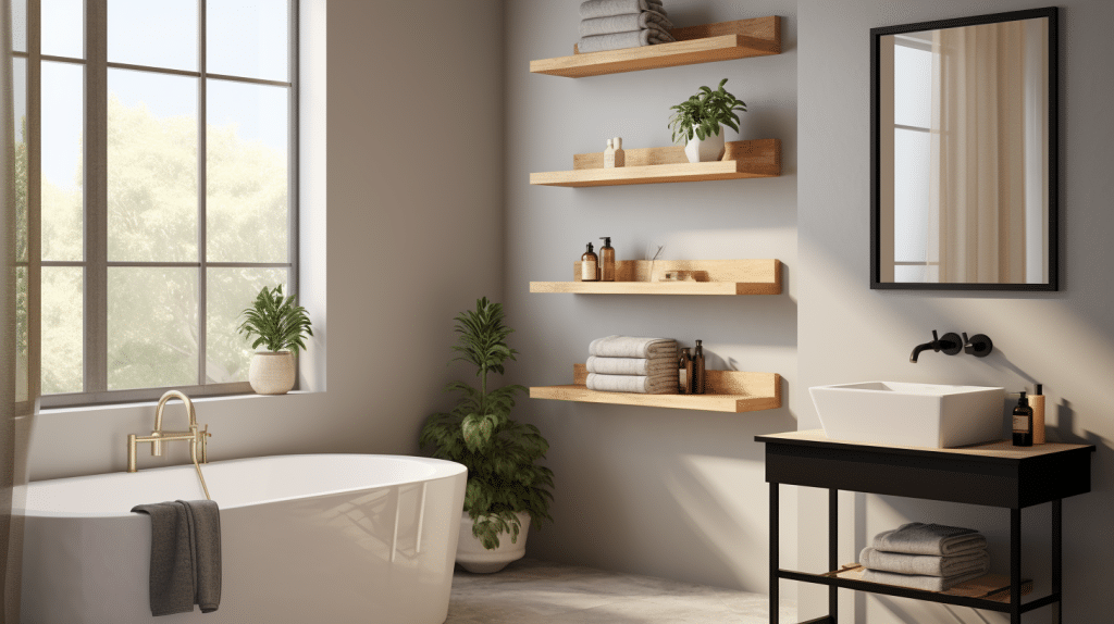 Opt for sleek and minimalistic wooden shelves to bring a contemporary touch to your bathroom decor. These shelves offer a clean look that complements various styles, from modern to farmhouse.