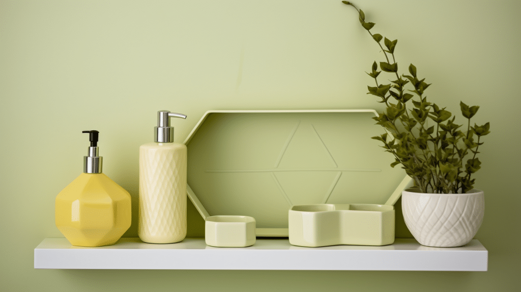 Enhance your bathroom shelf decor with geometric shapes for a modern and stylish look. Incorporate geometric-patterned jars, vases, or containers to add visual interest and depth. Mix in triangular or hexagonal shelves to create an eye-catching display.