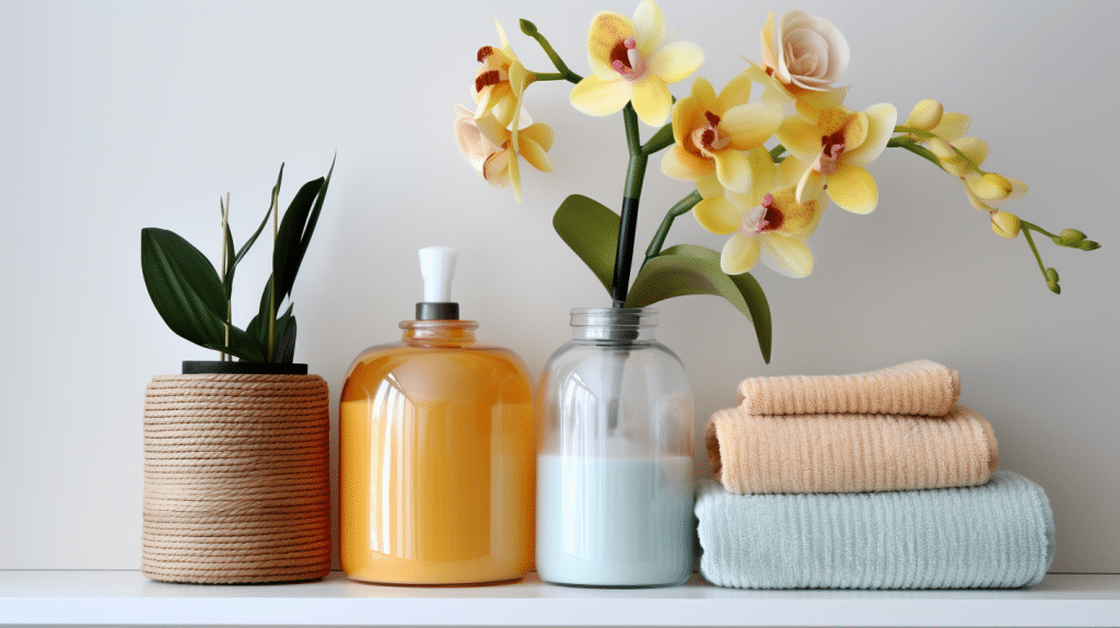 To refresh your bathroom decor, don’t overlook the opportunity to add seasonal touches to your shelves.