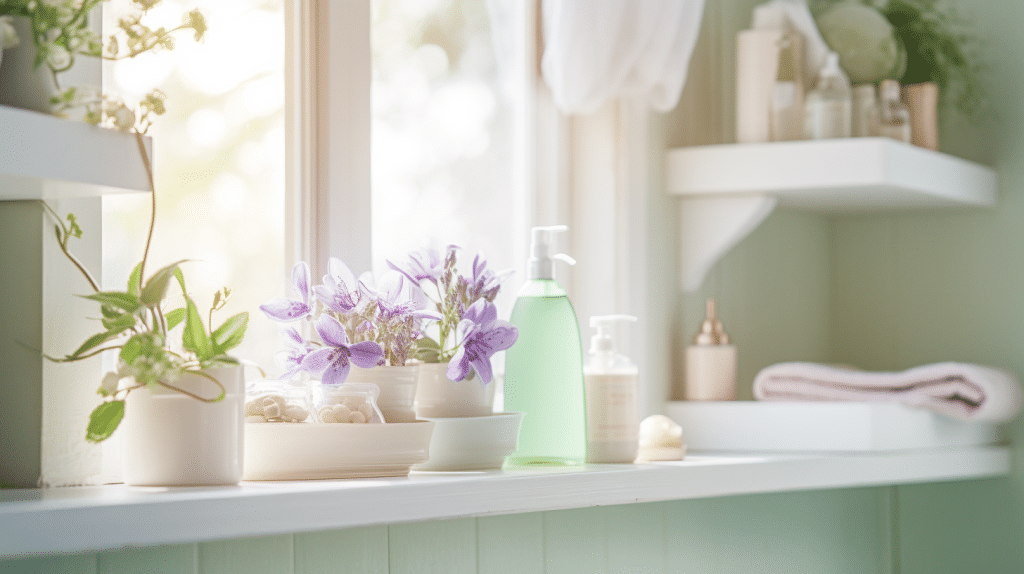 Use neutral tones like creams and light grays as a calming backdrop for bathroom shelf decor, making it easy to add pops of color.