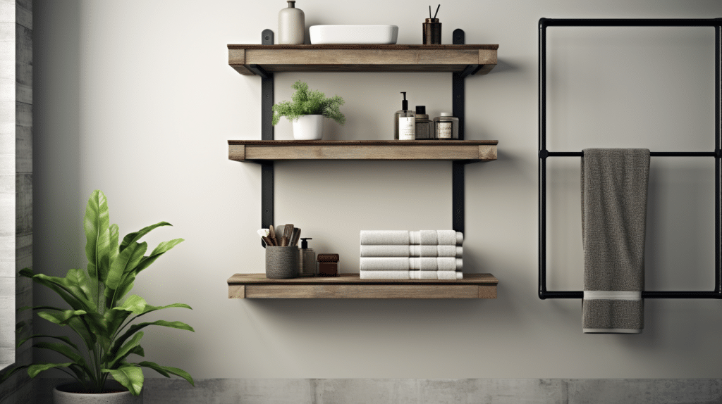 The combination of distressed wood and metal adds character and visual interest. It makes your bathroom shelves both functional and visually appealing.