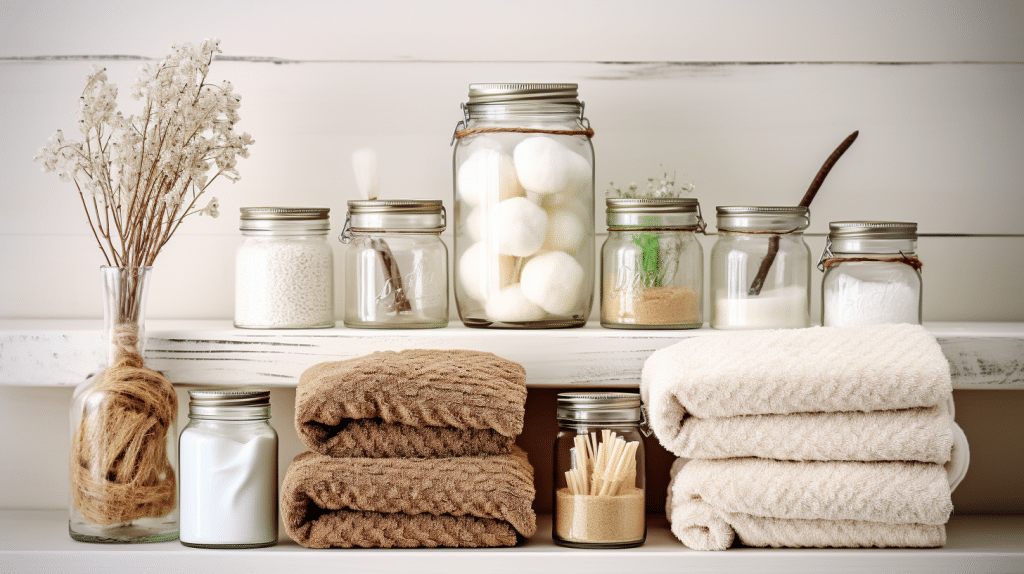 Place mason jars on the shelf to store cotton balls, swabs, and bath salts for a neat and organized look.