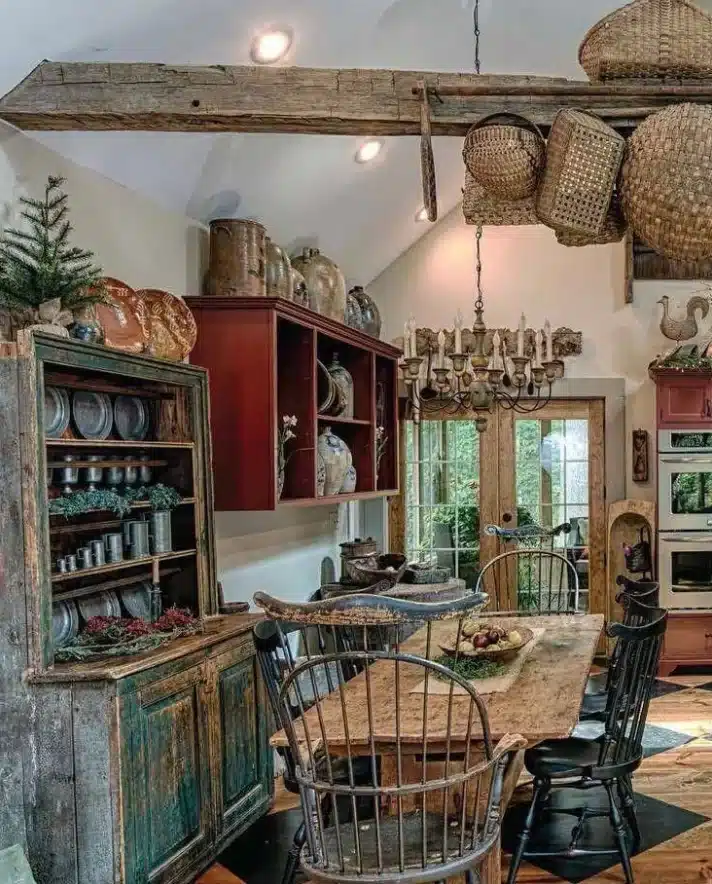 Its furnishings, decor, and accessories are all employed to create a seamless combination of traditional and contemporary aspects. For example, combining woven baskets and bright ceramics with vintage antiques such as wall clocks, chandeliers, blue and white porcelain plates, and mirrors results in a cohesive look. In addition, pitchers can be repurposed as vases to produce an attractive style that is at once rustic, sophisticated, and quaint.