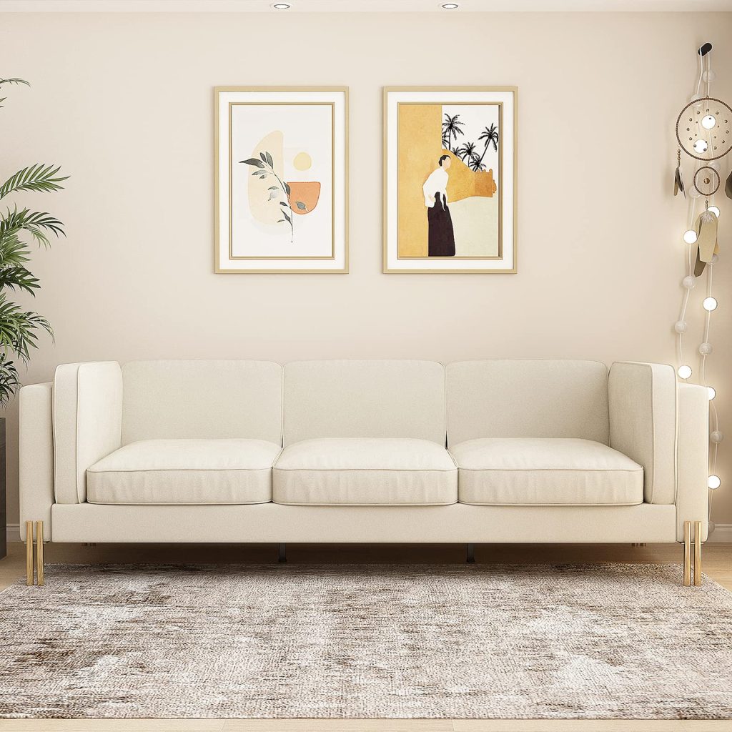 If you want to make the sofa a focal point of your living room, then add a beige linen tufted sofa. The neutral color and the linen texture give the room a modern touch. The tufted upholstery adds a timeless charm to the sofa.