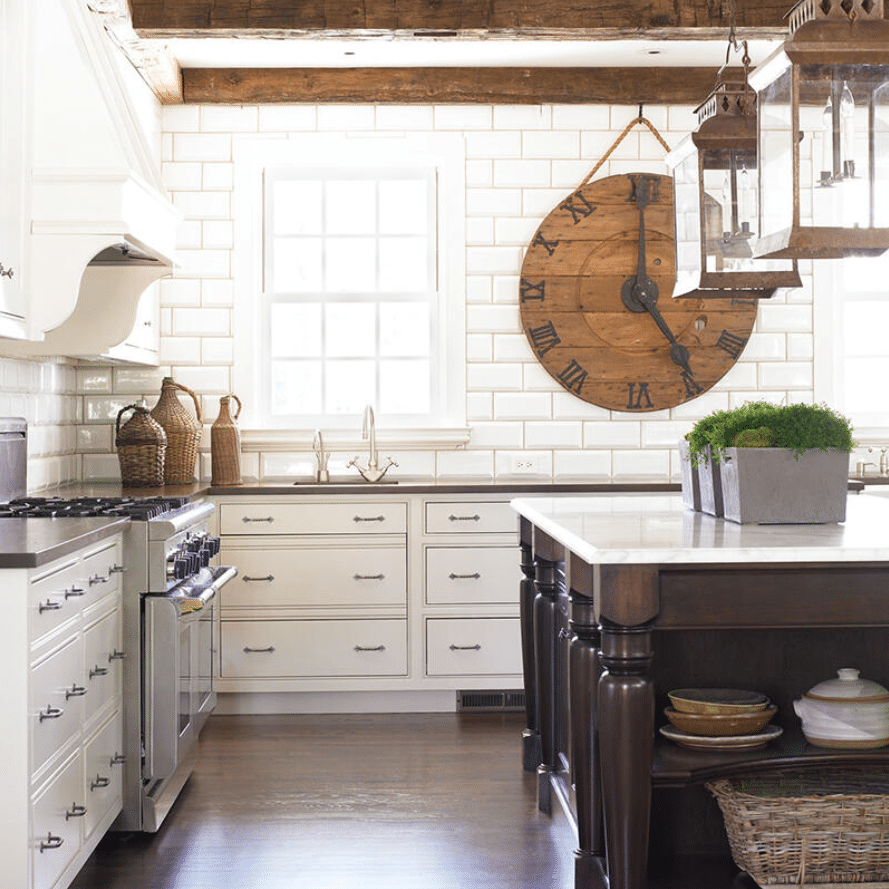 A clock with a weathered, vintage appearance is a perfect addition to any country kitchen. You may completely transform the look of your kitchen wall by hanging the clock over a shelf styled with a cotton flower vase, wooden candleholders, and a creative sign.