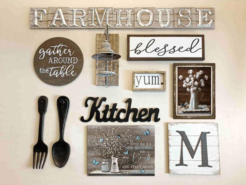 Decorating a farmhouse kitchen with a gallery wall is just as stunning as decorating a living room or hallway—first, select a general color scheme and design concept for your kitchen’s gallery wall.