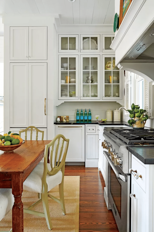 In a kitchen with a farmhouse aesthetic, upper cabinet space is limited; therefore, open shelving is encouraged. It’s a stylish solution for stacking tableware and serving pieces and is an attractive feature element in the kitchen. You can either chop and change the items on the showcase or keep them holistic, as shown in the above image.