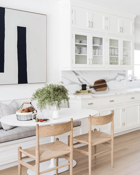 Here in this image is a built-in wall bench with alluring pink color. You can add a medium-sized rounded table and some chairs. Let the table be lightweight, and also the chairs be low height and matching to the breakfast nook. You can maintain the abundance of a single color here in this particular type of design. Make sure that the flowers are matching to the color scheme.