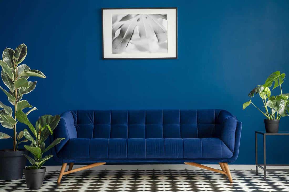 A blue wall with a blue velvet sofa gives artistic vibes to the decor of the living room and is perfect for creating a modern dark academia living room aesthetic. You can also put some navy-colored plant pots to give a stunning visual look to the room.