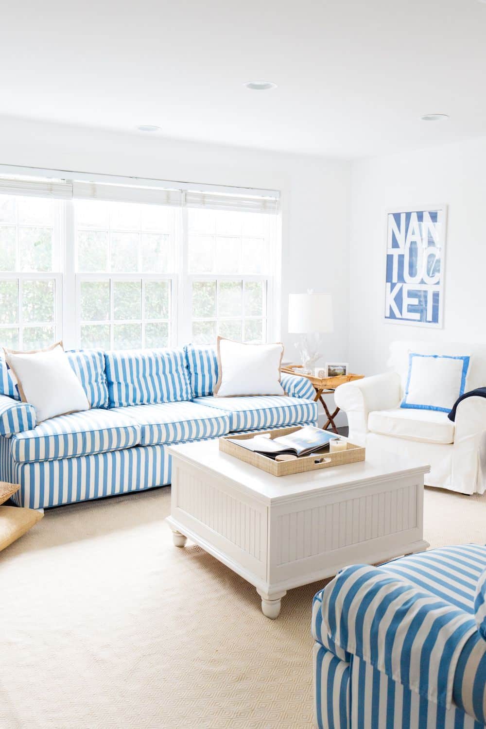 The blue and white striped sofa with pillows is arranged in front of a wall of bright white-trimmed windows. Underneath a frame of the blue and white print poster, an ivory slip-covered chair is placed. There’s no doubt that stripes give living rooms a more traditional and peppy vibe!