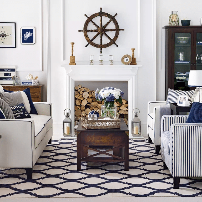 This look is a fusion of elegance and simplicity. The layout and ornamental pieces are some of the features that make it very homely. You can opt for fitted upholstery with smart piping and a stripe in navy blue. Dark wood furniture is perfect for this scheme. An oversized lamp, artwork, or even a salvaged ship’s wheel can add to the look.