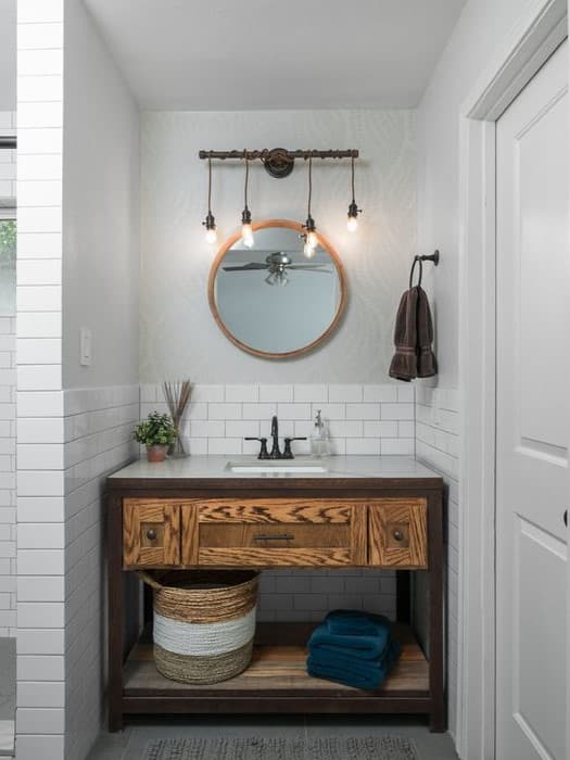 Industrial bathroom decor is basically a play between metal and wood accents with cold colors. Never be afraid to go big with copper light fixtures. Everyone deserves a perfect bathroom, and you can now have one!
