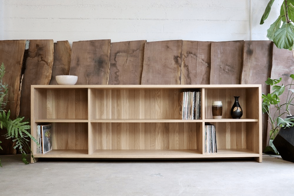 For those who favor modern minimalism with a touch of versatility, Material’s White Oak Low Bookcase is designed to fit perfectly in various settings, from record album displays to book storage. This piece stands out for its adaptable design, featuring adjustable shelves that can also be configured with drawers.