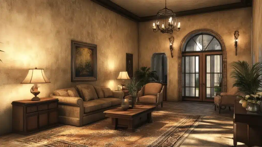 The 1990s home style was known as the “Tuscan” design, marked by beige colors, oak cabinets, and decorative wall features like niches and textured surfaces.