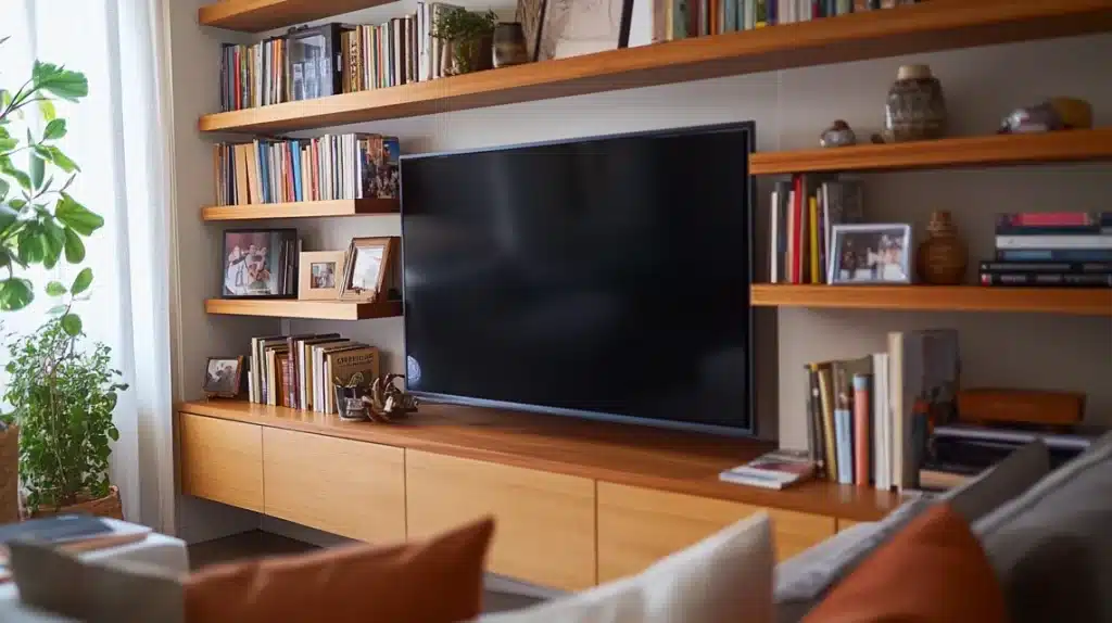 My shelves work great because they give me space to show off things I love while making that old TV spot look like it was always meant to be there.