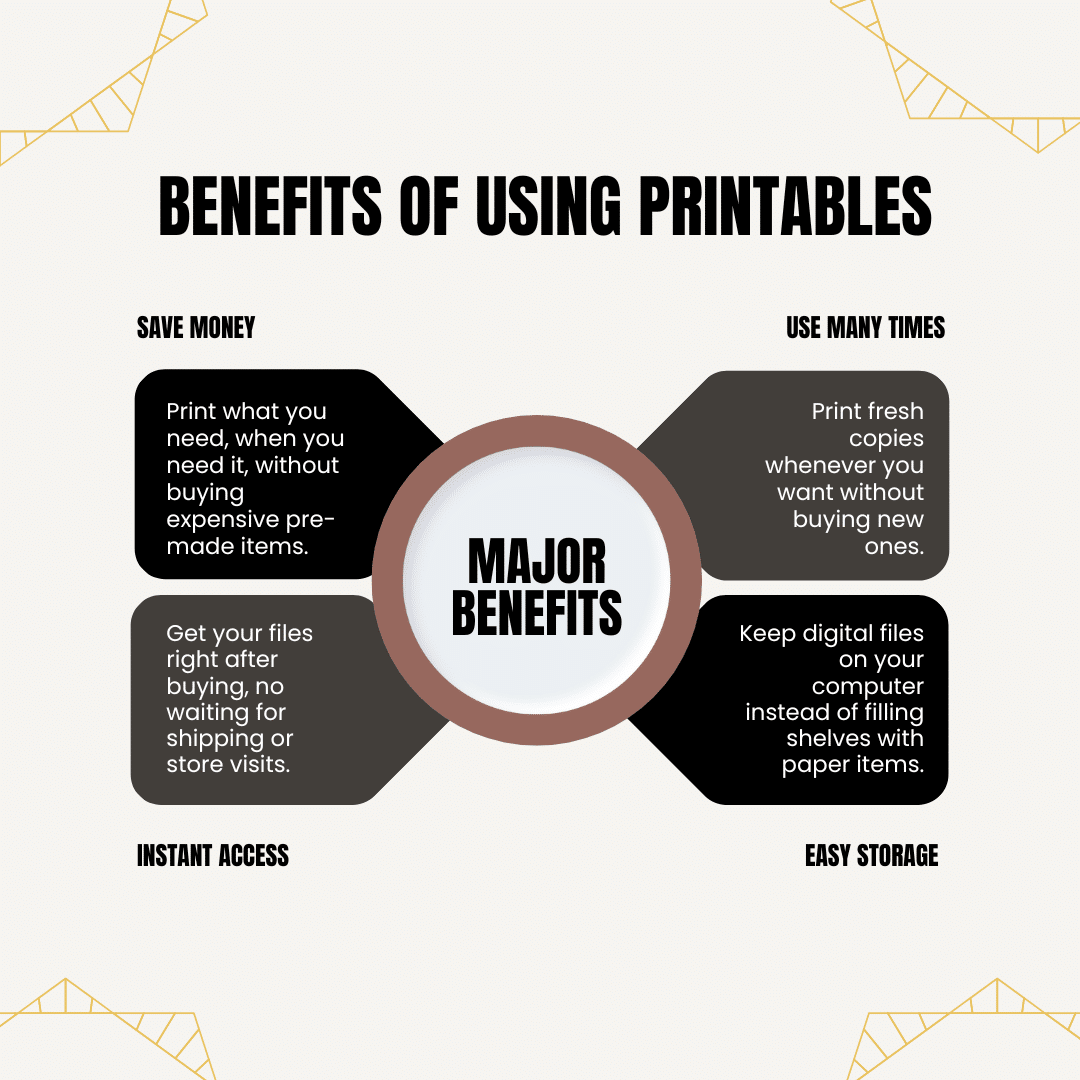 Printables are digital files you can download and print at home. Think of them like a digital book of paper tools. When I first learned about printables, I found them useful helpers for staying on top of daily tasks.