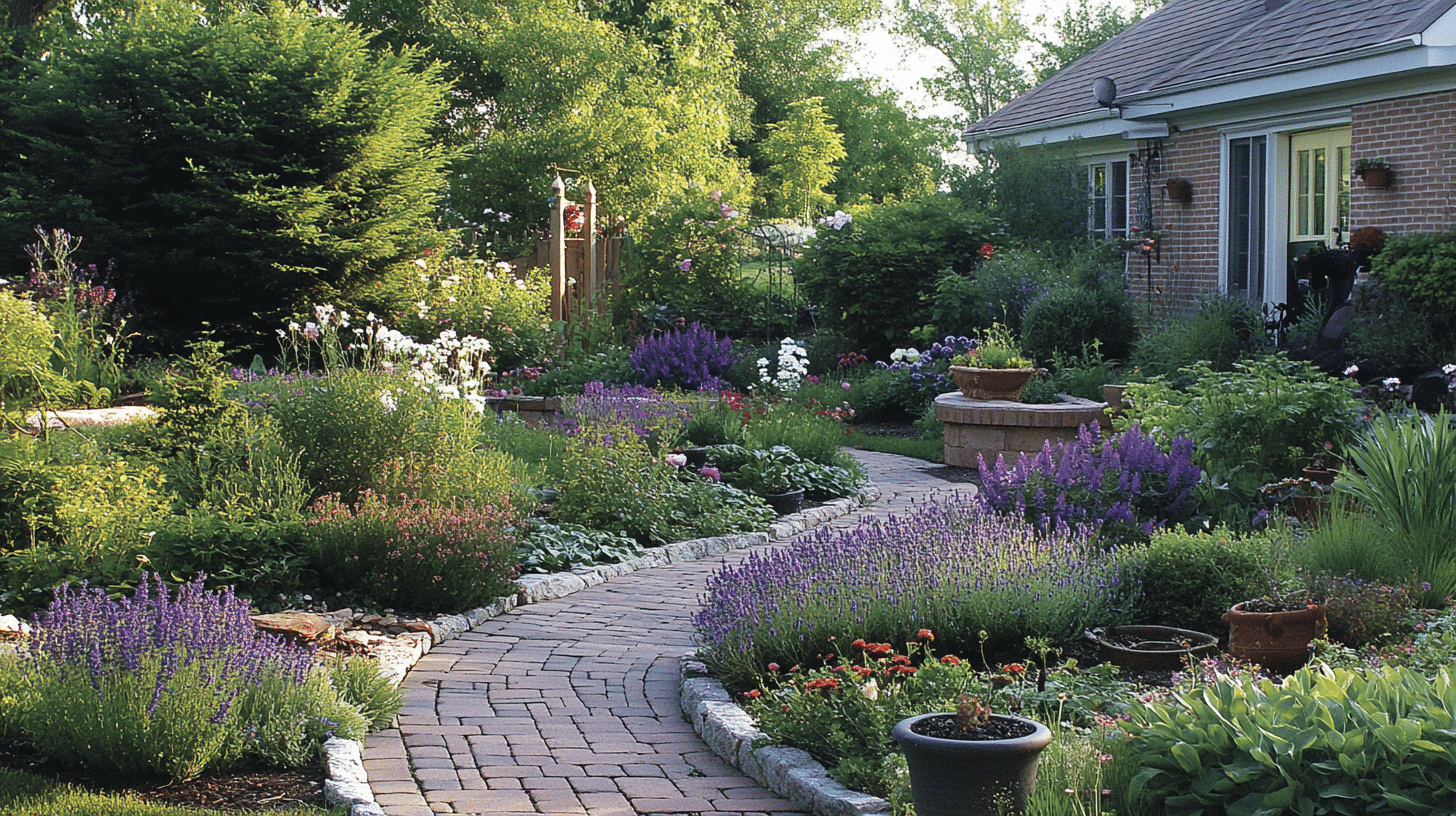 Plant roses, lavender, and climbing plants near walls. Create garden beds with curves rather than straight lines. Mix flowers, herbs, and small shrubs for a natural look.