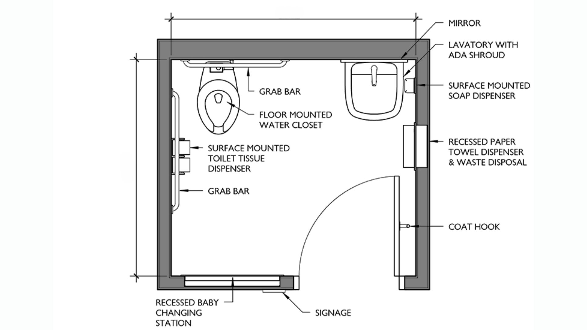 ADA bathrooms need special features for different situations. Some restrooms require changes for families, children, or portable use.
