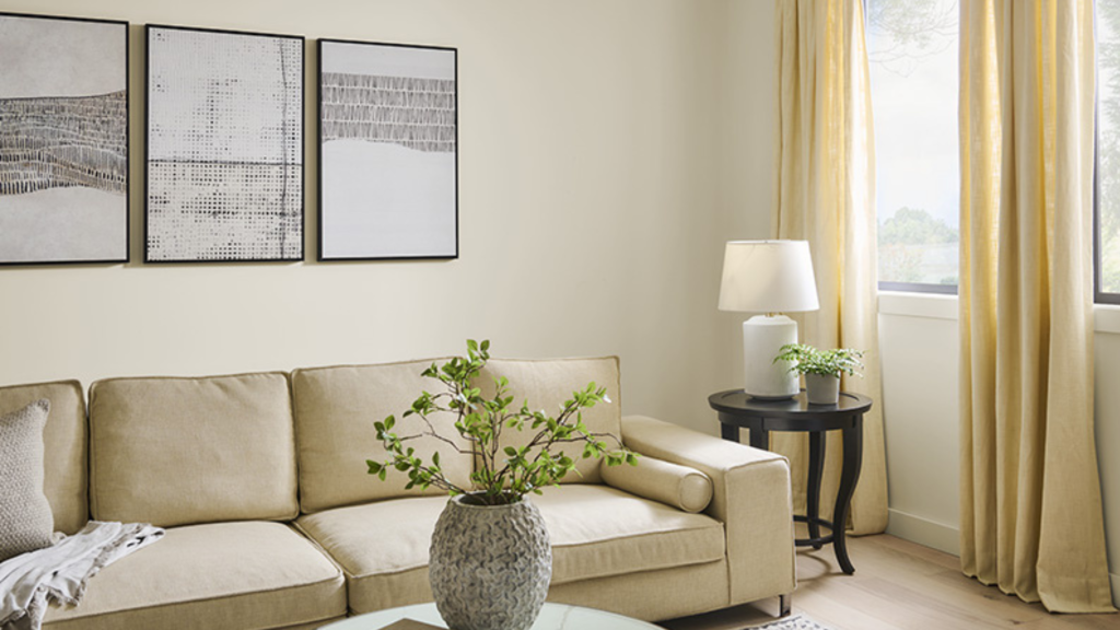 Warm lighting: In rooms with warm bulbs, Blank Canvas looks inviting and rich, almost like a classic off-white.