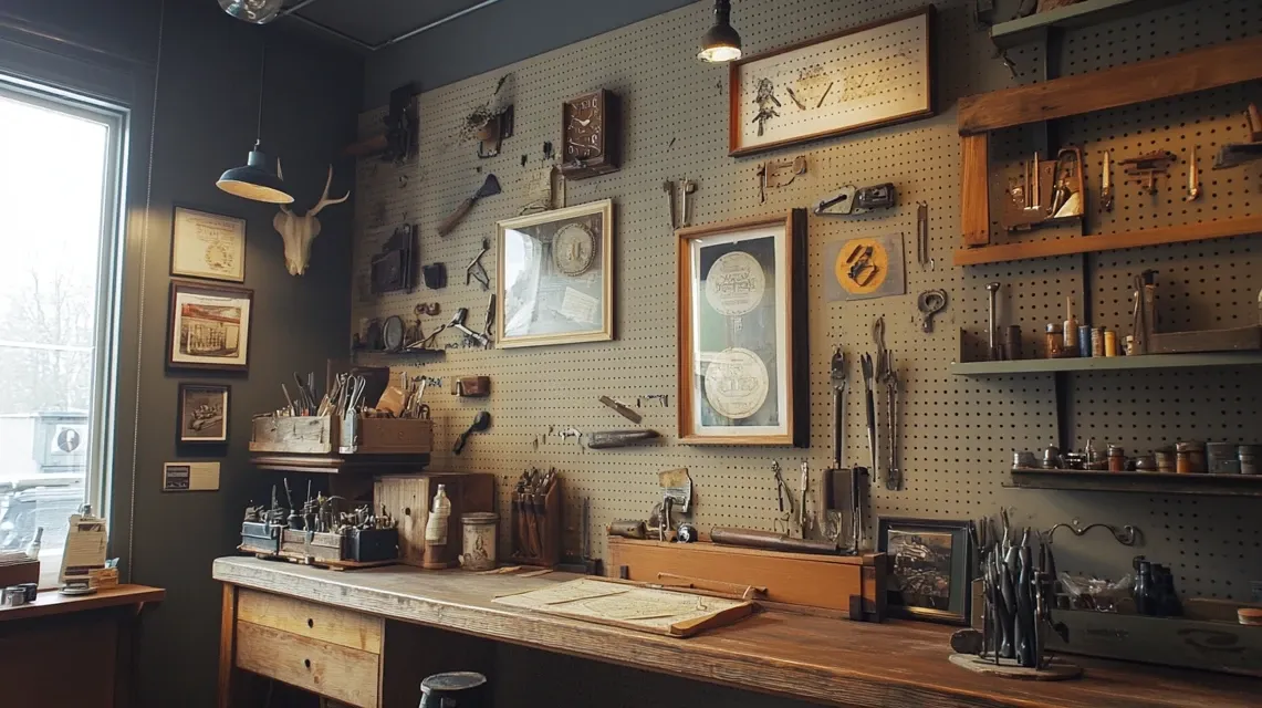 Use your wall space to hang items like mirrors, signs, or framed art. Pegboards or shelves work great to hold small stuff neatly.