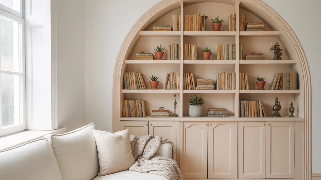 Arched built-in bookcases are shelves built into the wall with a soft, rounded top instead of sharp corners. The gentle curve adds a warm, cozy look and helps the bookcase flow into the wall like it’s part of the room.