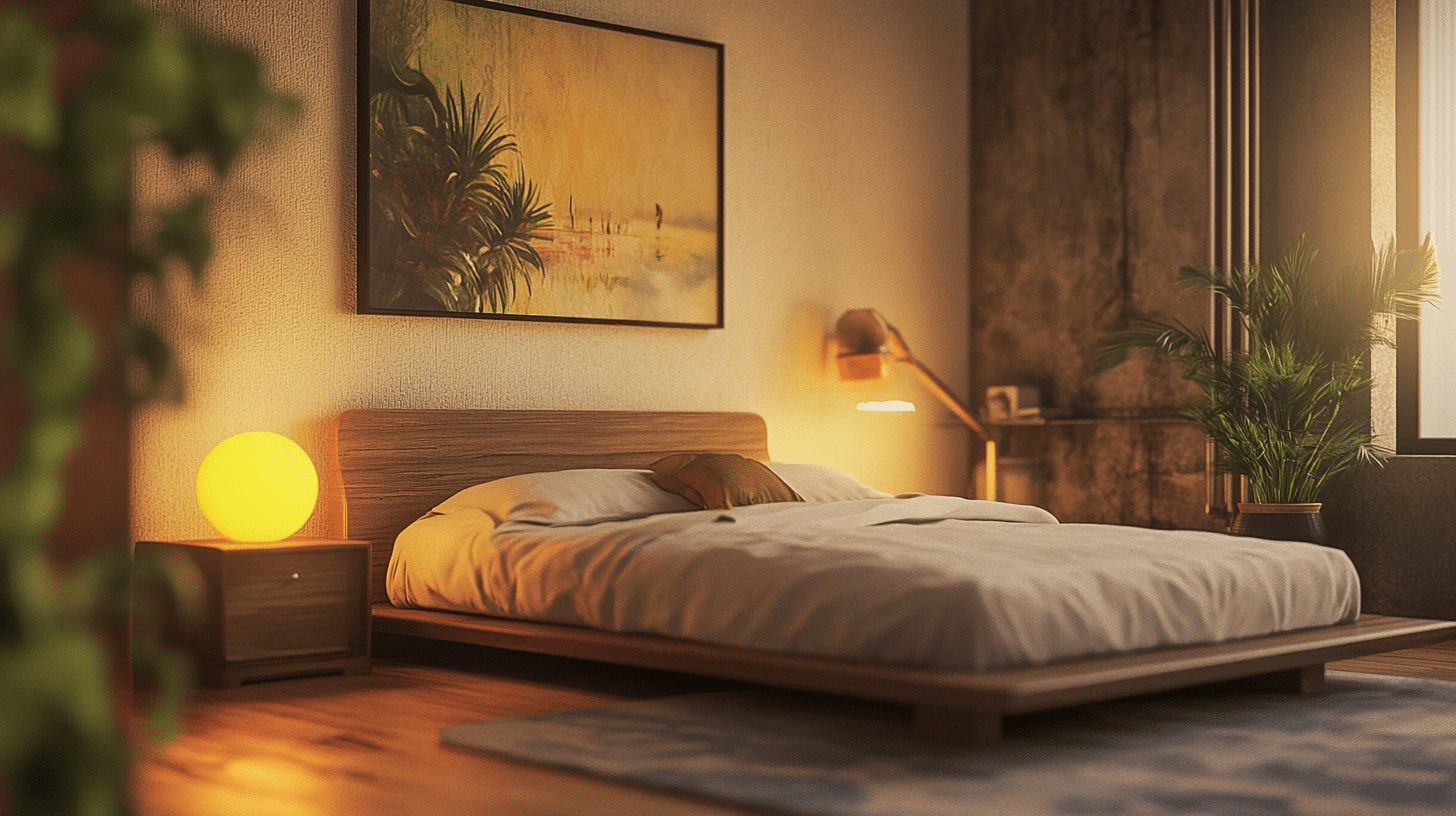 In the bedroom, try a nightstand and lamp combo on one side of the bed. On the other side, you could add wall art or a plant.