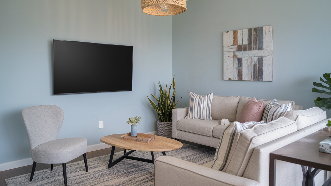 Consider shelves above the TV, lighting that mounts instead of stands, and furniture that serves dual purposes. Even small rooms can feel roomy with the proper setup.
