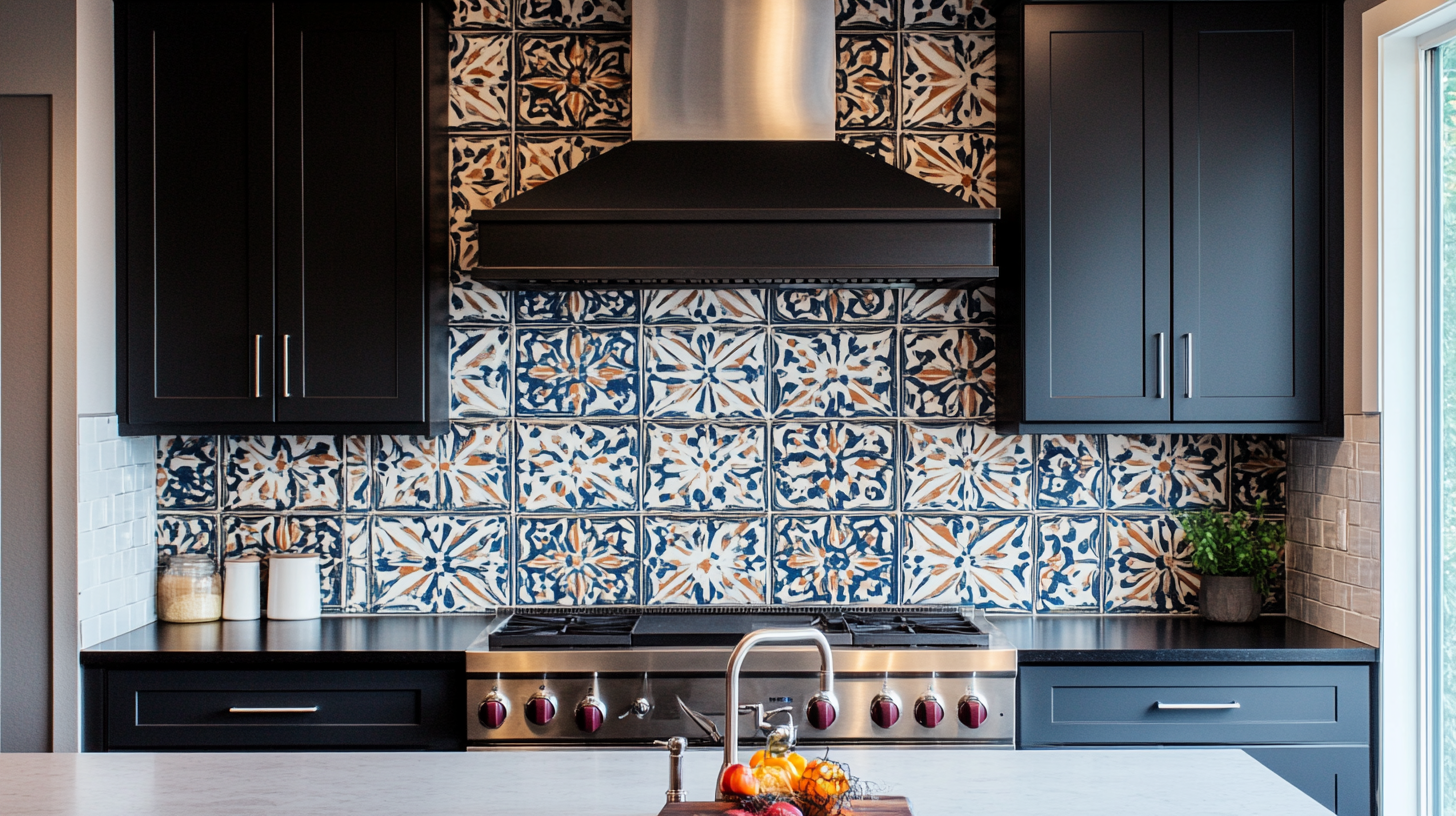 Cement tiles with shapes or flower designs add charm to a dark kitchen. They have a soft, matte look that balances the hard, dark cabinets. These tiles often have bold prints that make them the star of the room.