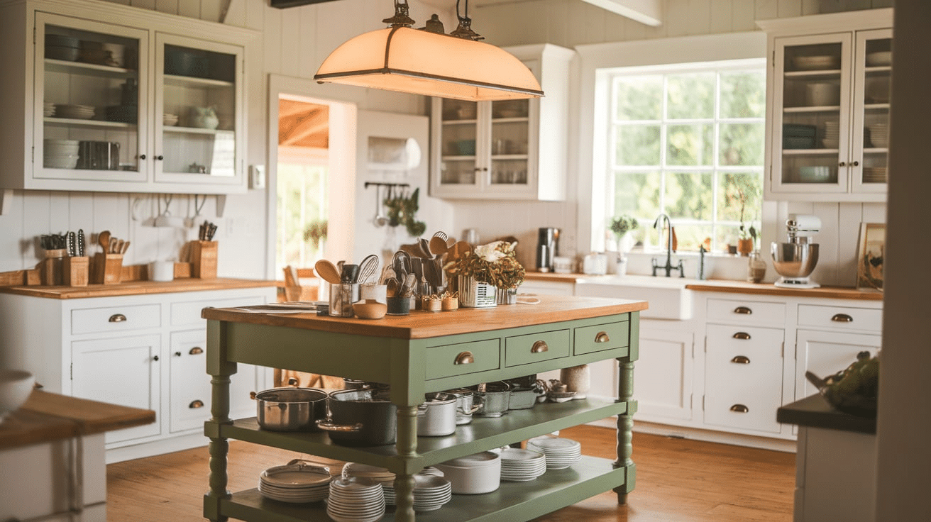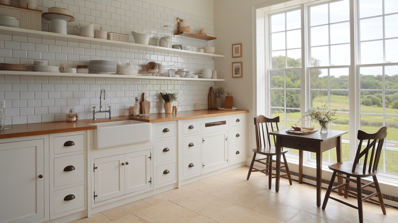 Use open shelving, a farmhouse sink, wood or butcher block countertops, vintage signs, and simple pendant lighting. Keep the color scheme neutral for a timeless look.