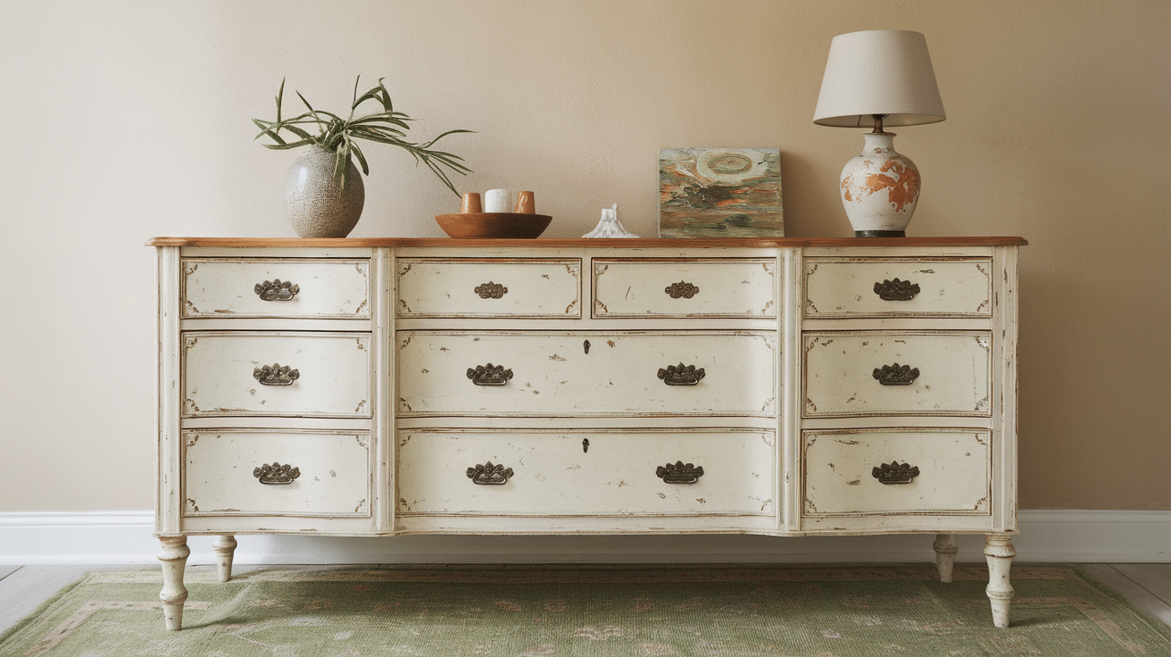 Farmhouse decor often includes distressed or aged-looking furniture. Instead of buying expensive vintage pieces, you can create the look yourself.